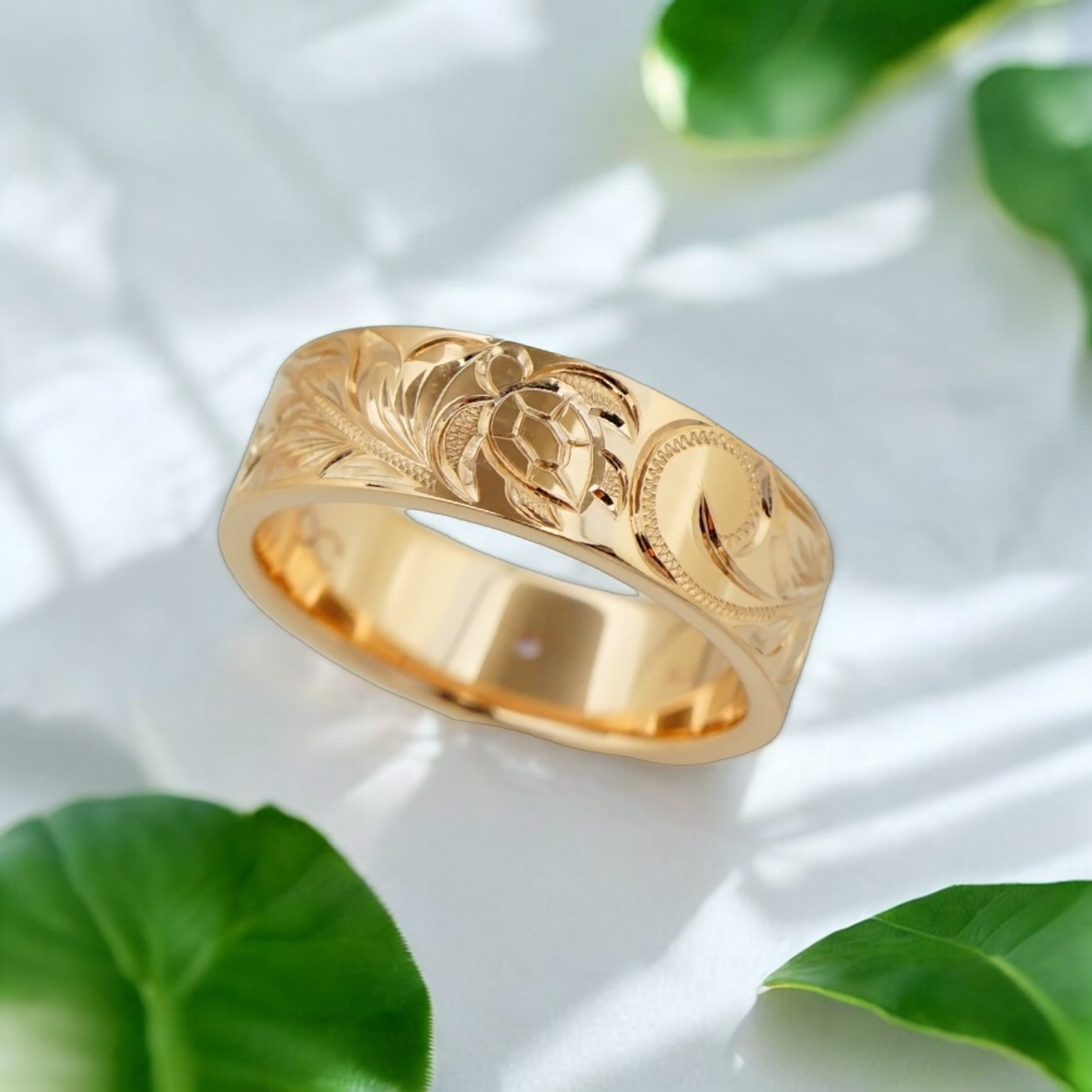 リングには、お互いのイニシャルと「愛しい人」の意味を持つハワイ語「Kuulei」を刻印。シンプルながらもお二人の愛を感じられる特別なデザインです。男性の方は、「デザインは全部好きなものにしたらいいよ」と、女性の想いを尊重されました。身に着けるたびに「素敵だね、いいね」というお言葉を何度もおっしゃっていました。