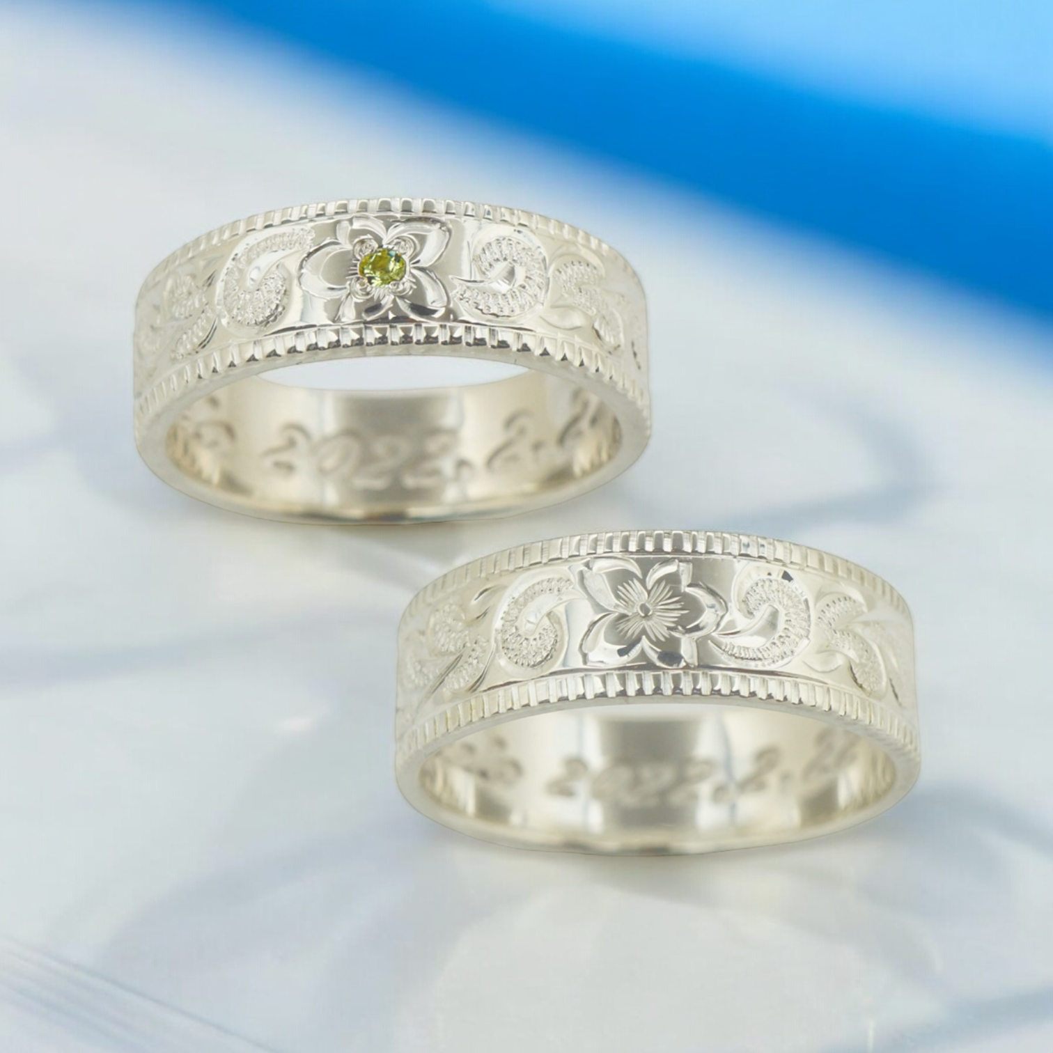 リングの中央には奥さまの誕生石である8月のペリドットをプルメリアのモチーフとともにあしらいました。リングの内側には、結婚記念日の月日とお互いのイニシャル。