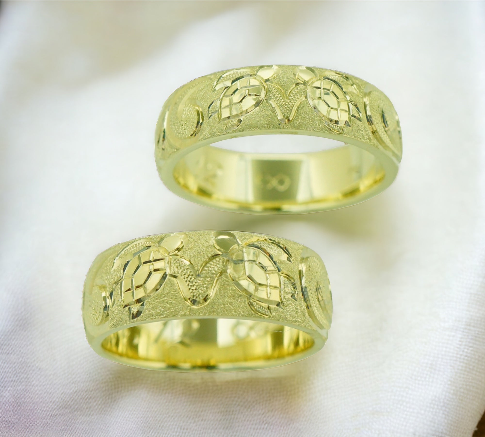 長年ハワイアンジュエリーを愛用しているお客様から、新しいリングのご注文をいただきました。以前からSVリングを身に着けており、そのお気に入りのデザインをもとに、今回は豪華なグリーンゴールドでオーダーメイド。左手薬指に着ける特別なリングとして、「家族愛」を象徴するパームツリー。幸せを運ぶホヌ(ウミガメ)のモチーフをデザインに取り入れました。