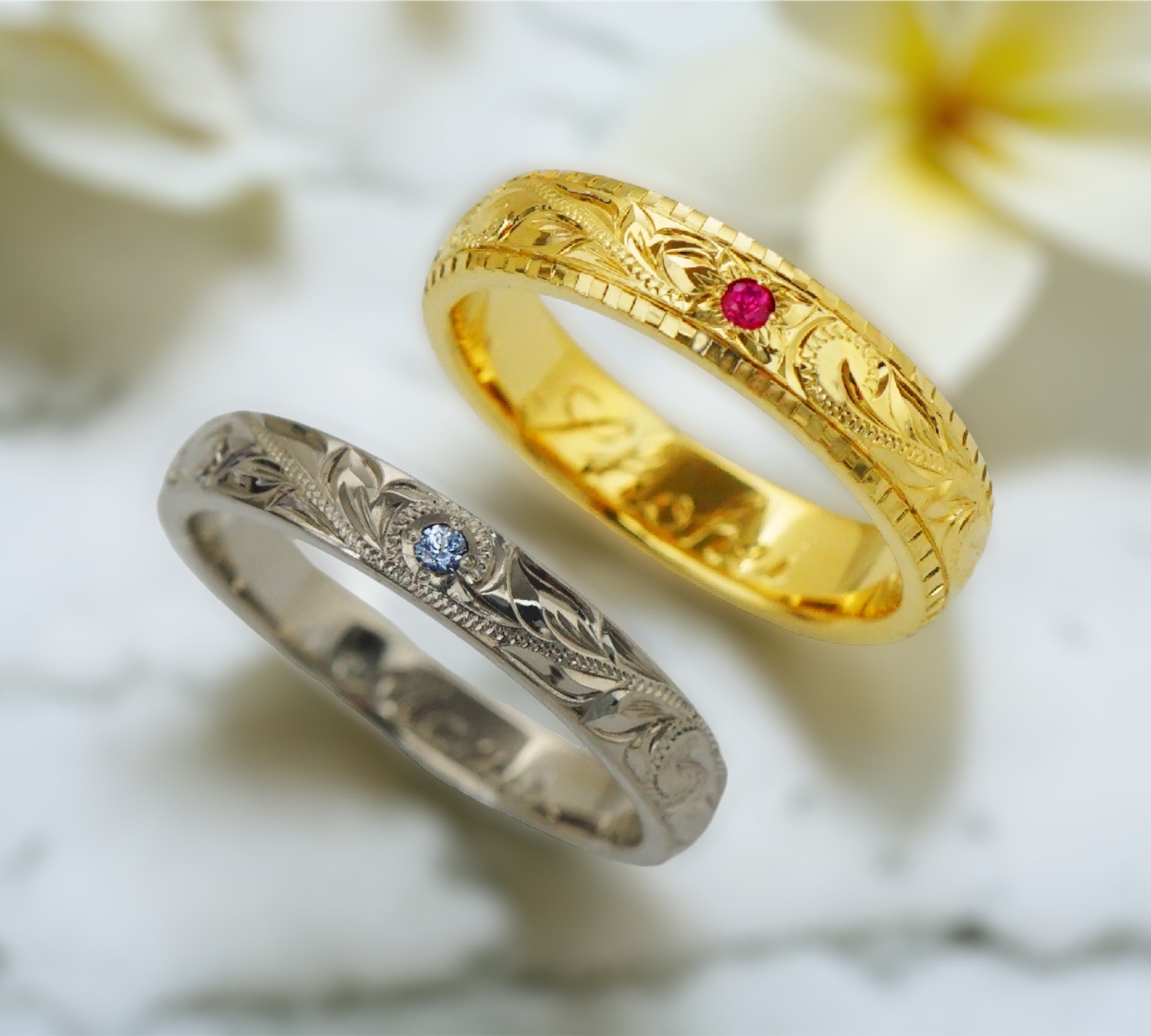 - ワンポイントデザイン (上)プルメリア(7月・ルビー)