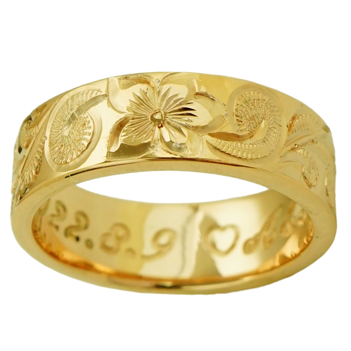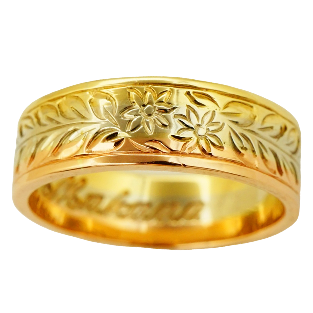 マイレの葉脈を表現しているコインカットは、かつて王族しか身に着けられなかったとされる貴重なデザイン。プルメリアと組み合わせてレイのようにかたどると「守り神が二人を守ってくれる」という意味合いになります。